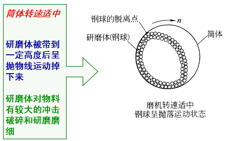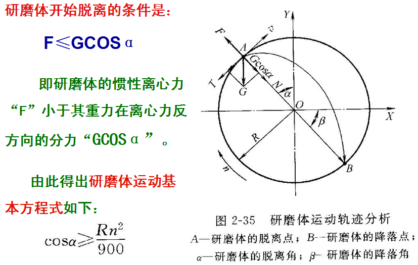 研磨體運(yùn)動(dòng)基本方程式的含義:研磨體脫離角(或降落高度)與筒體轉(zhuǎn)速及研磨體所在半徑有關(guān),而與研磨體質(zhì)量無(wú)關(guān)。
